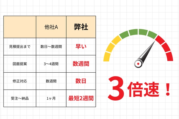 図面確定後、平均約2週間~1.5ヶ月で納品可能です。もちろん納期や価格も、ご相談ください。