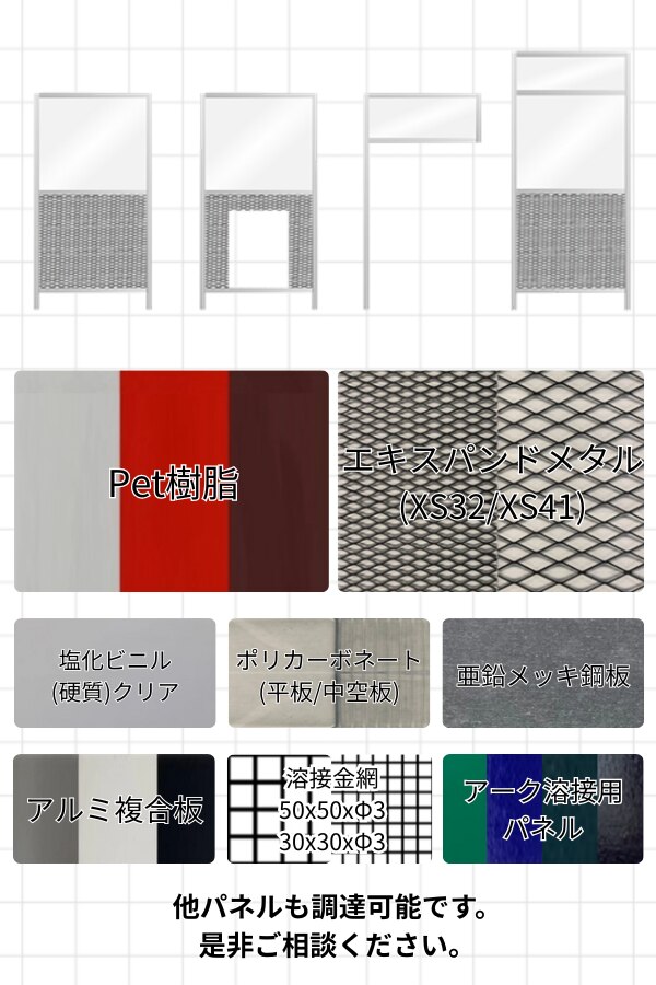 パネルはPET・エキスパンドメタルに加え、溶接光対策や視認性重視など多目的に対応したラインナップを常備。安全性と使いやすさの両立を実現します。