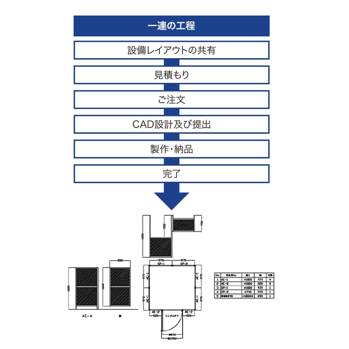 お客様ごとに異なる設備レイアウトに合わせ、サイズ調整から構造設計までフルカスタム対応。「既製品では収まらない」「加工の手間を減らしたい」といった課題を、用途や動線を踏まえた最適設計で解消します。