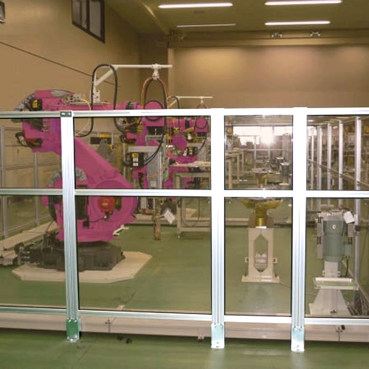 ロボット安全柵は、産業用ロボットの可動域を安全防護柵で囲い、事故を未然に防止する為の安全柵です。安全柵には透明な樹脂素材を使用する事で設備内が可視化され、防音効果やスパッタ等の飛散物から通路側の作業者に対しても安全防護になります。