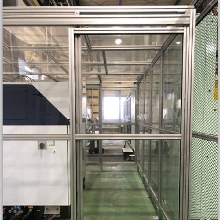 屋根付き小屋とは、対象機器全体を囲うアルミプロファイルの安全柵です。カメラ等の吊るし上げや、空調管理の用途にもご使用頂いております。スライド式ドアの設置も可能で、中に入る構造とすることもできます。